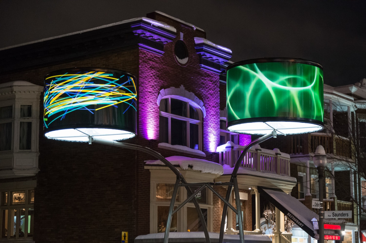 Manon de Pauw, professeure à l’école des arts visuels et médiatiques, signe l’édition 2018-2019 de Lumière sur l’art en créant 34 œuvres inédites pour l’occasion. L’artiste s’est amusée avec ce concept unique plus grand que nature : «J’ai abordé Lumière sur l’art comme un jeu sur la lumière, la matière, la forme et la couleur, une exploration sur la temporalité et la circularité des images, toujours en considérant le point de vue des passants, explique-t-elle. Les abat-jours sont à la fois des objets utilitaires et des supports artistiques, allumés le soir et éteints le jour. Ces dualités m’ont interpellée dans ma manière de concevoir le parcours.»
